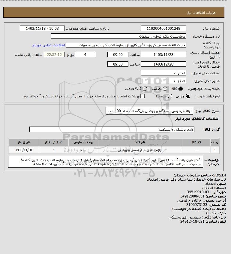 شرح کلی نیاز: لوله خرطومی دستگاه بیهوشی بزرگسال تعداد 400 عدد