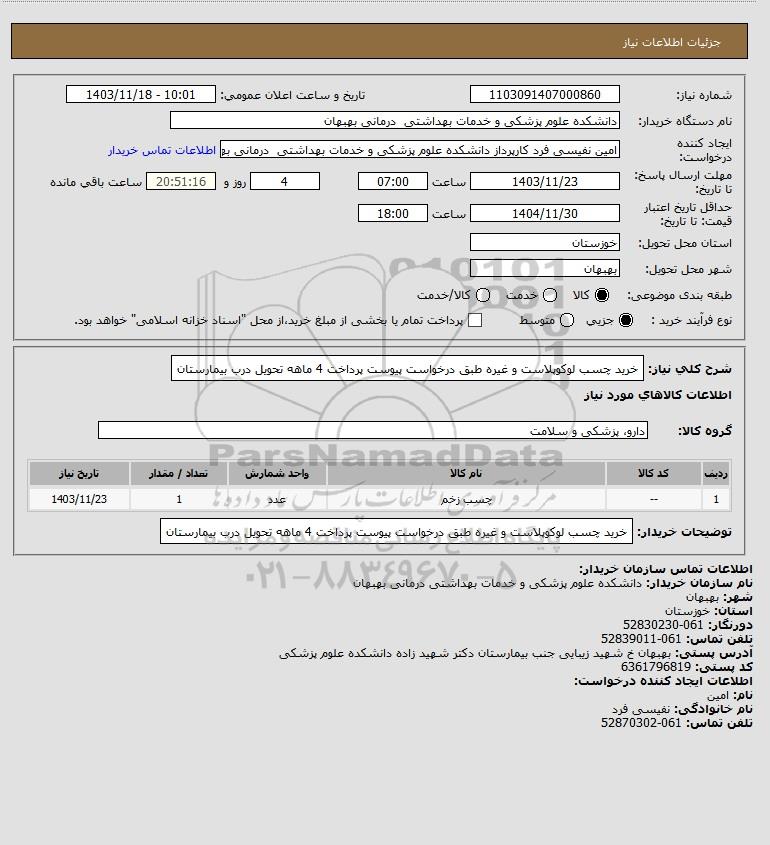 شرح کلی نیاز: خرید چسب لوکوپلاست و غیره طبق درخواست پیوست پرداخت 4 ماهه تحویل درب بیمارستان