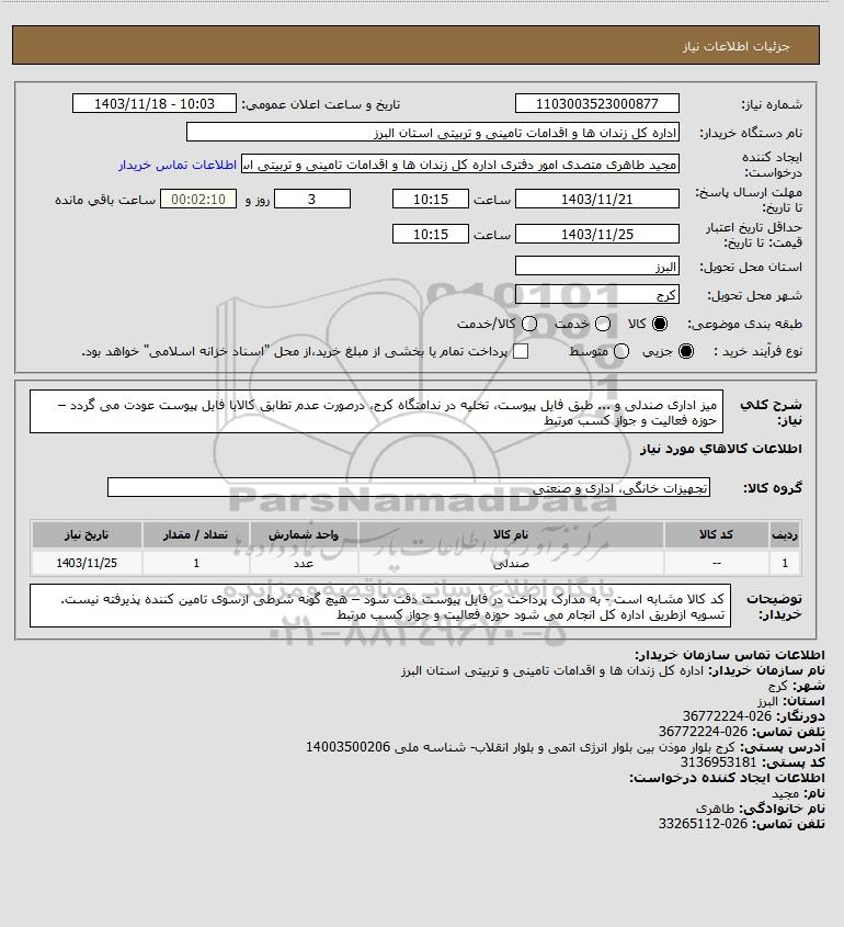 شرح کلی نیاز: میز اداری صندلی و ... طبق فایل پیوست، تخلیه در ندامتگاه کرج، درصورت عدم تطابق کالابا فایل پیوست عودت می گردد – حوزه فعالیت و جواز کسب مرتبط
