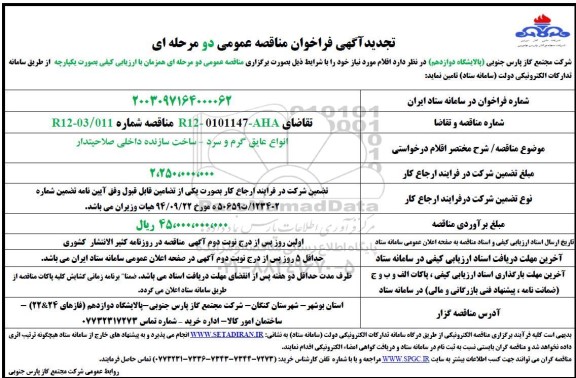 آدرس مناقصه گزار: استان بوشهر - شهرستان کنگان- شرکت مجتمع گاز پارس جنوبی - پالایشگاه دوازدهم فاز 22 & 24 - ساختمان امور کالا- اداره خرید - شماره تماس 07732317273