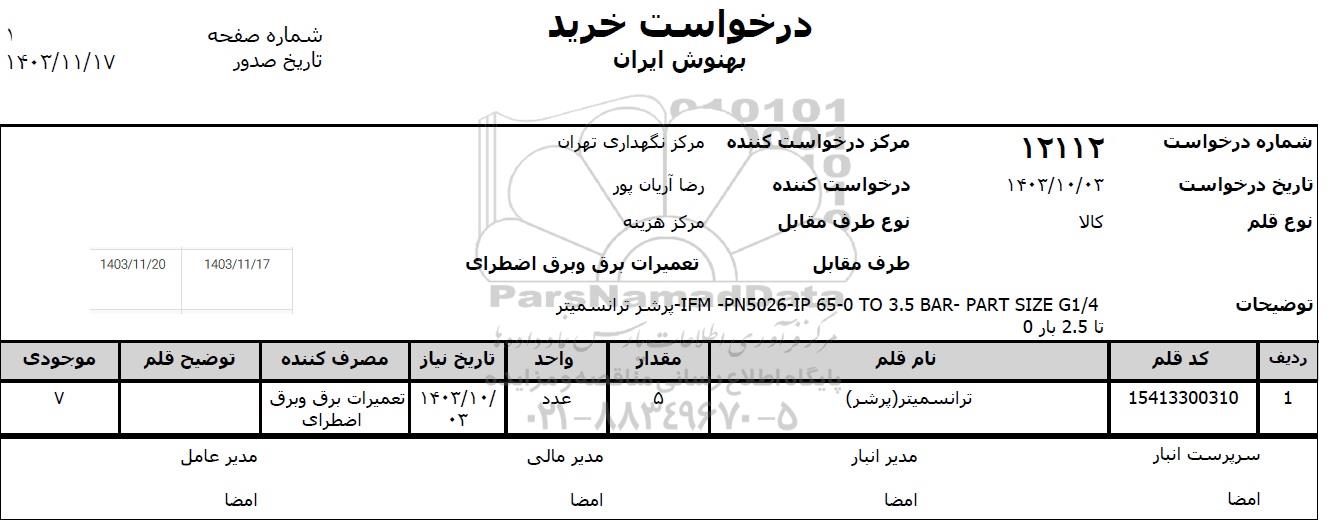 1 15413300310 ترانسمیتر (پرشر) 5 عدد 1403.10.3 تعمیرات برق و برق اضطراری   7