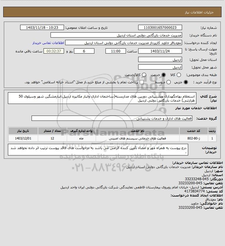 شرح کلی نیاز: استعلام بهاءنگهداری وپشتیبانی دوربین های مداربسته(ساختمان اداری وانبار مکانیزه اردبیل،انبارمشگین شهر وسیلوی 50 هزارتنی) خدمات بازرگانی دولتی اردبیل