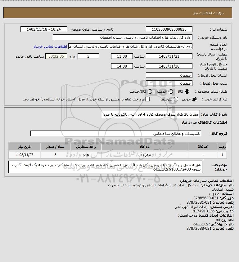شرح کلی نیاز: مخزن 20 هزار لیتری عمودی کوتاه 4 لایه انتی باکتریال- 8 عدد