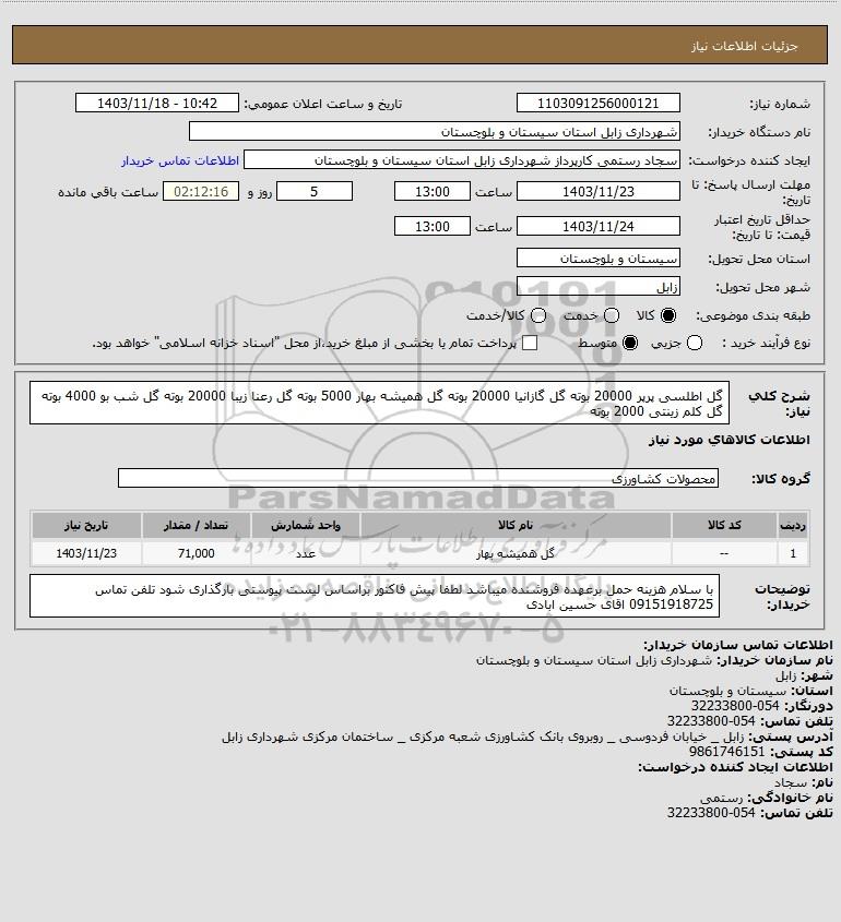 شرح کلی نیاز: گل اطلسی پرپر 20000 بوته گل گازانیا 20000 بوته گل همیشه بهار 5000 بوته گل رعنا زیبا 20000 بوته گل شب بو 4000 بوته گل کلم زینتی 2000 بوته