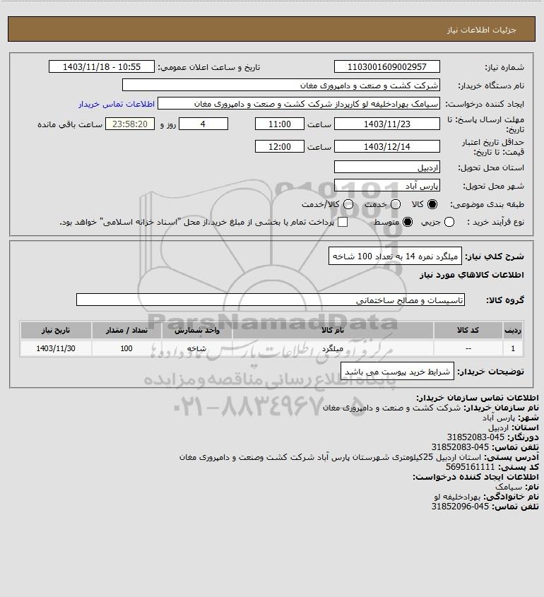 شرح کلی نیاز: میلگرد نمره 14 به تعداد 100 شاخه