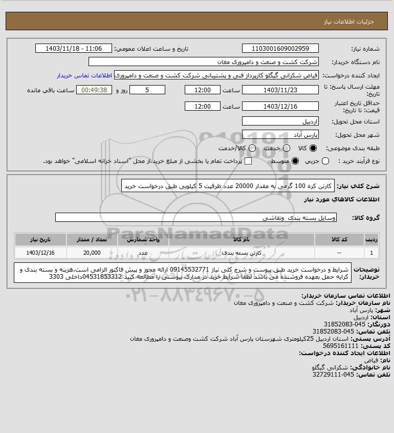 شرح کلی نیاز: کارتن کره 100 گرمی به مقدار 20000 عدد ظرفیت 5 کیلویی طبق درخواست خرید