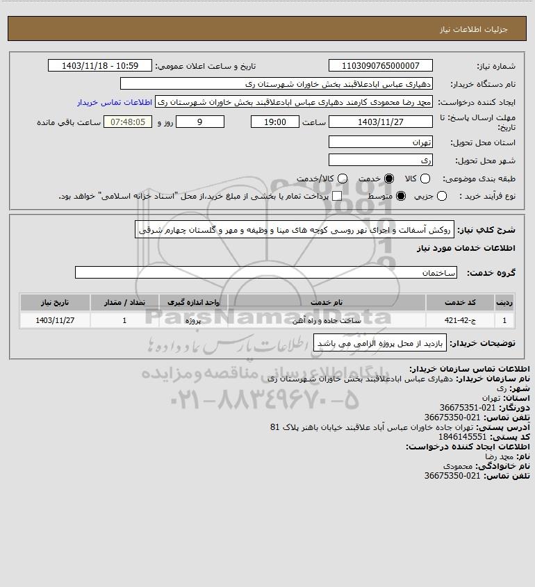 نام دستگاه خریدار:دهیاری عباس ابادعلاقبند بخش خاوران شهرستان ری