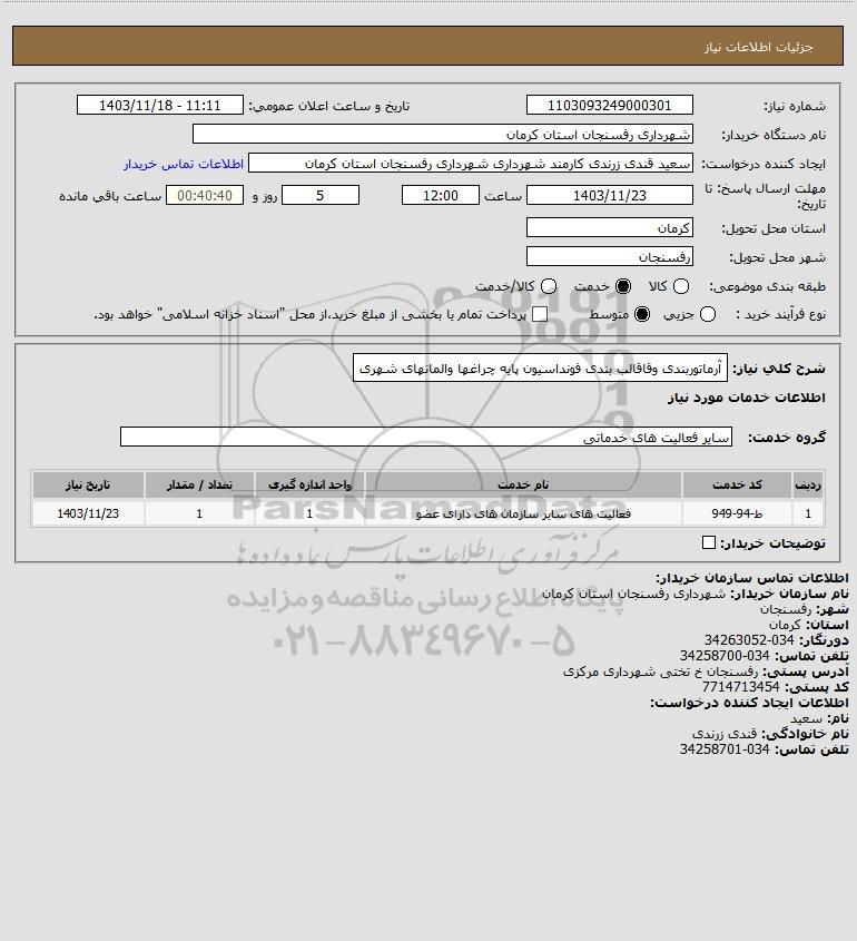 شرح کلی نیاز: آرماتوربندی وقاقالب بندی فونداسیون پایه چراغها والمانهای شهری