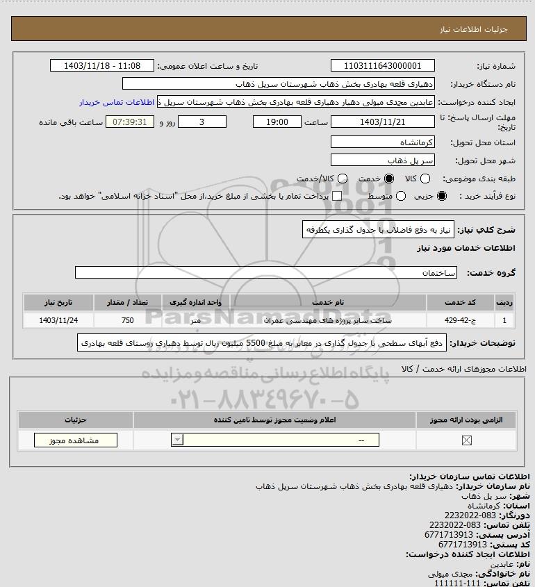 توضیحات خریدار:دفع آبهای سطحی با جدول گذاری در معابر به مبلغ 5500 میلیون ریال توسط دهیاری روستای قلعه بهادری