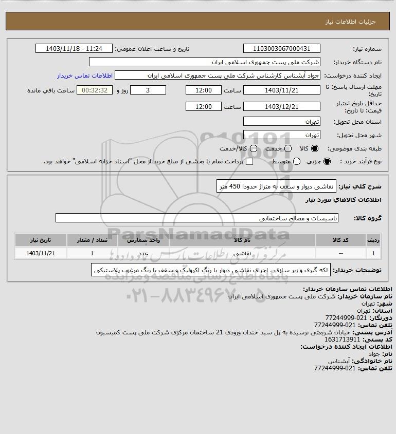 شرح کلی نیاز: نقاشی دیوار و سقف به متراژ حدودا 450 متر