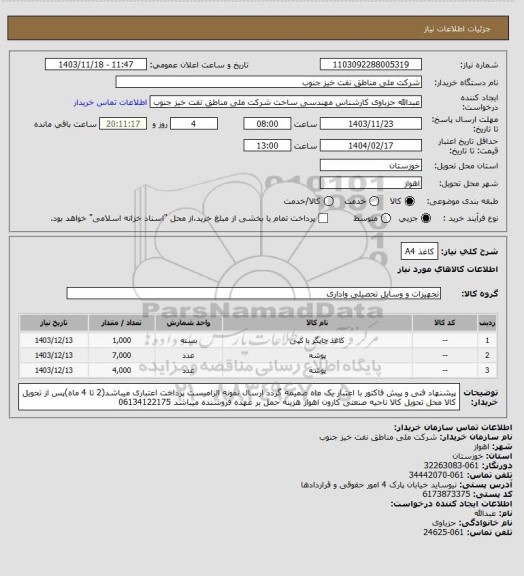 | 1 | -- | کاغذ چاپگر یا کپی | بسته | 1,000 | 1403/12/13 |