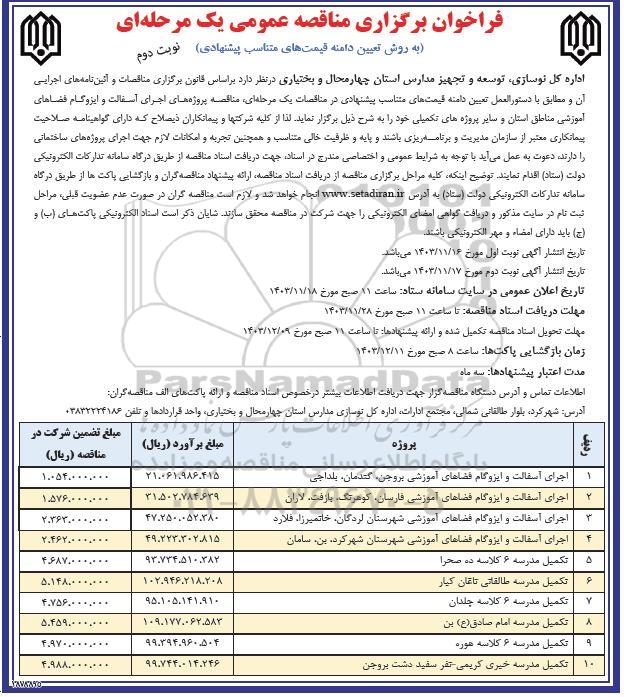 اداره کل نوسازی، توسعه و تجهیز مدارس استان چهارمحال و بختیاری در نظر دارد بر اساس قانون برگزاری مناقصات و آئین نامه های اجرایی آن و مطابق با دستور العمل تعیین دامنه قیمت های متناسب پیشنهادی در مناقصات یک مرحله ای مناقصه پروژه های اجرای آسفالت و ایزوگام فضاهای آموزشی مناطق استان و سایر پروژه های تکمیلی خود را به شرح ذیل برگزار نماید. لذا از کلیه شرکتها و پیمانکاران ذیصلاح که دارای گواهینامه صلاحیت پیمانکاری معتبر از سازمان مدیریت و برنامه ریزی باشند و پایه و ظرفیت خالی متناسب و همچنین تجربه و امکانات لازم جهت اجرای پروژه های ساختمانی را دارند دعوت به عمل می آید با توجه به شرایط عمومی و اختصاصی مندرج در اسناد، جهت دریافت اسناد مناقصه از طریق درگاه سامانه تدارکات الکترونیکی دولت (ستاد) اقدام نمایند. توضیح اینکه کلیه مراحل برگزاری مناقصه از دریافت اسناد مناقصه ارائه پیشنهاد مناقصه گران و بازگشایی پاکت ها از طریق درگاه سامانه تدارکات الکترونیکی دولت (ستاد) به آدرس سایت ستاد ایران انجام خواهد شد و لازم است مناقصه گران در صورت عدم عضویت قبلی مراحل ثبت نام در سایت مذکور و دریافت گواهی امضای الکترونیکی را جهت شرکت در مناقصه محقق سازند. شایان ذکر است اسناد الکترونیکی پاکتهای (ب) و (ج) باید دارای امضاء و مهر الکترونیکی باشند.