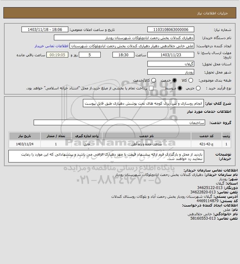 شرح کلی نیاز: انجام روسازی و بتن ریزی کوچه های تحت پوشش دهیاری طبق فایل پیوست