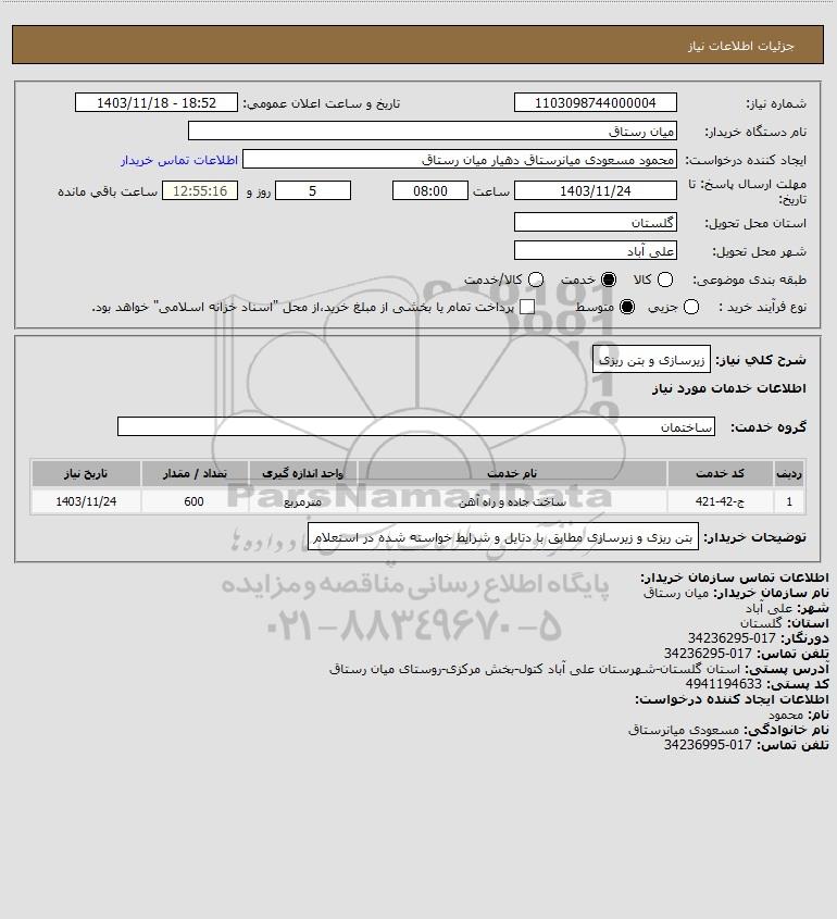 شرح کلی نیاز: زیرسازی و بتن ریزی