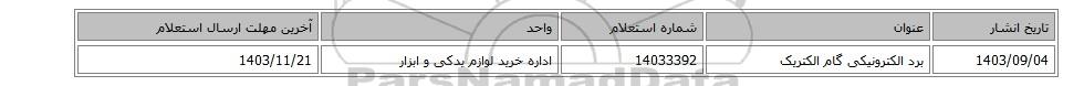 | 1403/09/04 | برد الکترونیکی گام الکتریک | 14033392 | اداره خرید لوازم یدکی و ابزار | 1403/11/21 |
