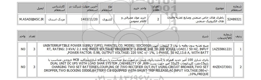 | 52489321 | باطری های خاص صنعتی ومنابع تغذیه والمان های الکترونیک صنعتی | 2 | خرید مواد مصرفی و اقلام عمومی | کشوری | 1403/11/20 | مزدک اسدی | M.ASADI@KSC.IR |