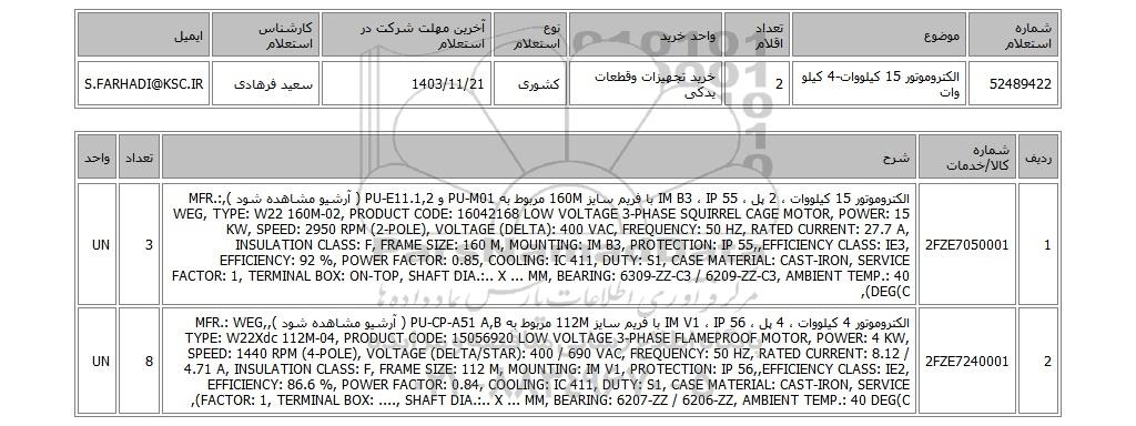 | 52489422 | الکتروموتور 15 کیلووات-4 کیلو وات | 2 | خرید تجهیزات وقطعات یدکی | کشوری | 1403/11/21 | سعید فرهادی | S.FARHADI@KSC.IR |