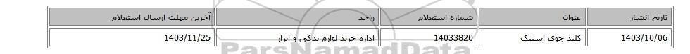 | 1403/10/06 | کلید جوی استیک | 14033820 | اداره خرید لوازم یدکی و ابزار | 1403/11/25 |