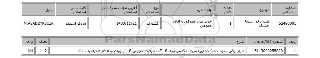| 52490001 | هیتر برقی سونا خشک | 1 | خرید مواد مصرفی و اقلام عمومی | کشوری | 1403/11/21 | مزدک اسدی | M.ASADI@KSC.IR |