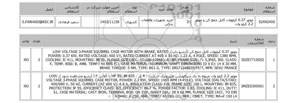 | 52492400 | موتور 0.37 کیلووات کابل جمع کن و موتور 2.2 کیلو وات | 2 | خرید تجهیزات وقطعات یدکی | کشوری | 1403/11/28 | سعید فرهادی | S.FARHADI@KSC.IR |