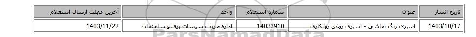 | 1403/10/17 | اسپری رنگ نقاشی - اسپری روغن روانکاری | 14033910 | اداره خرید تاسیسات برق و ساختمان | 1403/11/22 |