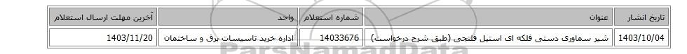 | 1403/10/04 | شیر سماوری دستی فلکه ای استیل فلنجی (طبق شرح درخواست) | 14033676 | اداره خرید تاسیسات برق و ساختمان | 1403/11/20 |