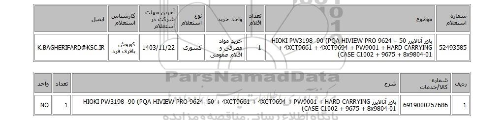| 52493585 | پاور آنالایزر HIOKI PW3198 -90 (PQA HIVIEW PRO 9624 – 50 + 4XCT9661 + 4XCT9694 + PW9001 + HARD CARRYING CASE C1002 + 9675 + 8x9804-01) | 1 | خرید مواد مصرفی و اقلام عمومی | کشوری | 1403/11/22 | کوروش باقری فرد | K.BAGHERIFARD@KSC.IR |