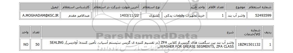 52493599واشر آب بند1خرید تجهیزات وقطعات یدکیکشوری1403/11/22عبدالامیر مقدمA.MOGHADAM@KSC.IR