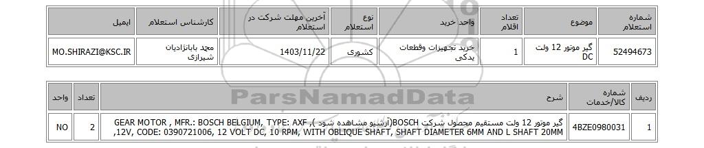 | 52494673 | گیر موتور 12 ولت DC | 1 | خرید تجهیزات وقطعات یدکی | کشوری | 1403/11/22 | محمد بابانژادیان شیرازی | MO.SHIRAZI@KSC.IR |