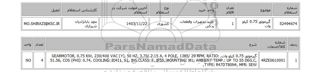 | 52494674 | گیرموتور 0.75 کیلو وات | 1 | خرید تجهیزات وقطعات یدکی | کشوری | 1403/11/22 | محمد بابانژادیان شیرازی | MO.SHIRAZI@KSC.IR |