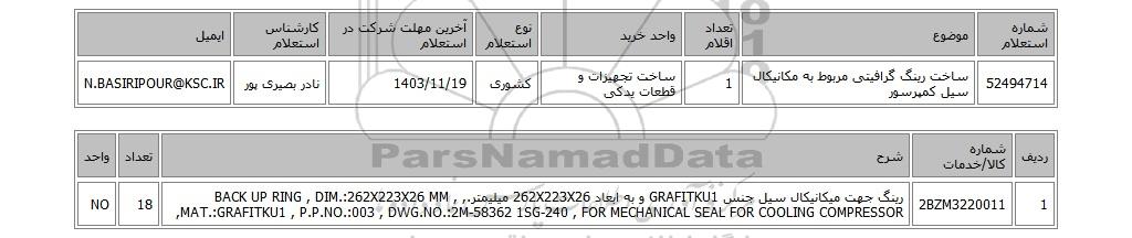 | 52494714 | ساخت رینگ گرافیتی مربوط به مکانیکال سیل کمپرسور | 1 | ساخت تجهیزات و قطعات یدکی | کشوری | 1403/11/19 | نادر بصیری پور | N.BASIRIPOUR@KSC.IR |