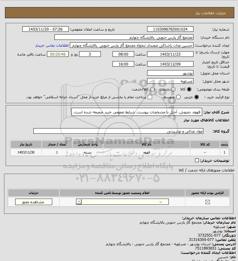 شرح کلی نیاز: قهوه، دمنوش، آجیل با مشخصات پیوست. شرایط عمومی خرید ضمیمه شده است.