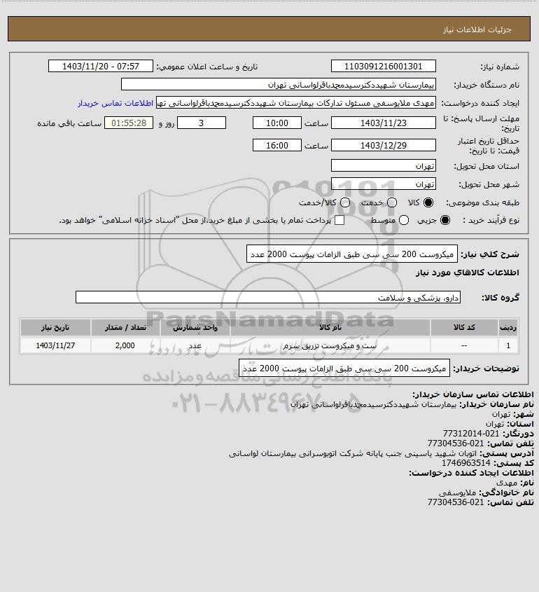 شرح کلی نیاز: میکروست 200 سی سی طبق الزامات پیوست 2000 عدد