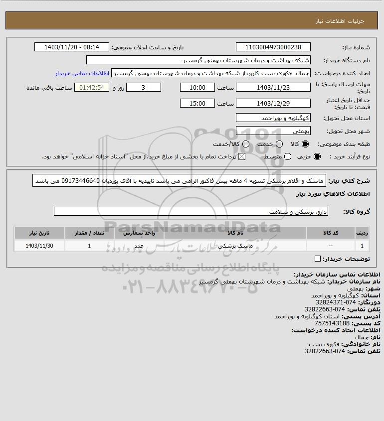 | 1 | -- | ماسک پزشکی | عدد | 1 | 1403/11/30 |