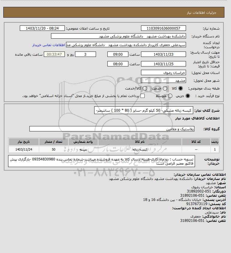 شرح کلی نیاز: کیسه زباله مشکی- 50 کیلو گرم -سایز ( 80 * 100 ) سانتیمتر-