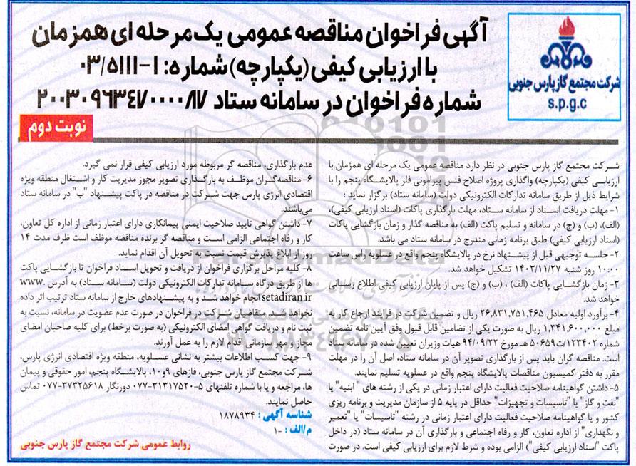 آگهی فراخوان مناقصه عمومی یک مرحله ای همزمان با ارزیابی کیفی یکپارچه شماره 1- 03/5111 نوبت دوم