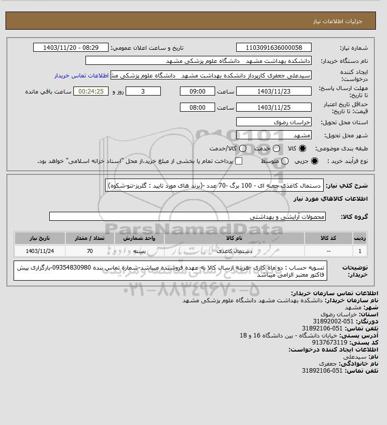 | 1 | -- | دستمال کاغذی | بسته | 70 | 1403/11/24 |