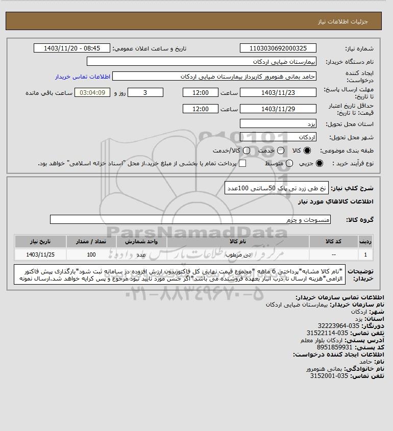 شرح کلی نیاز: نخ طی زرد تی پاک 50سانتی 100عدد