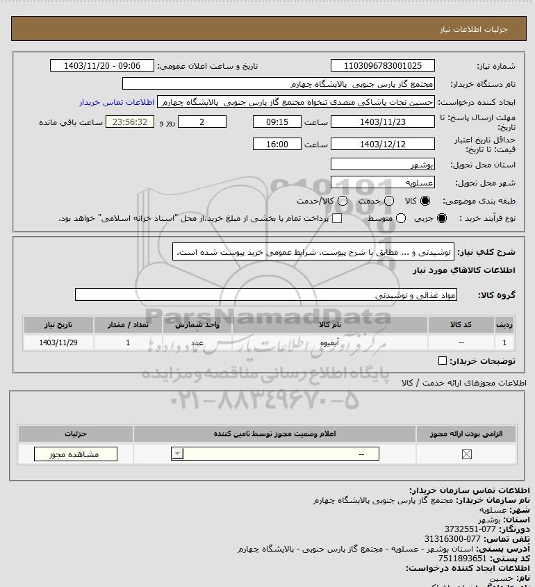 شرح کلی نیاز: نوشیدنی و ... مطابق با شرح پیوست. شرایط عمومی خرید پیوست شده است.