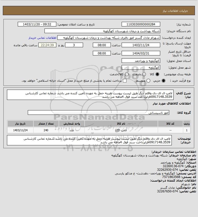 | 1 | -- | لامپ LED | عدد | 240 | 1403/11/24 |