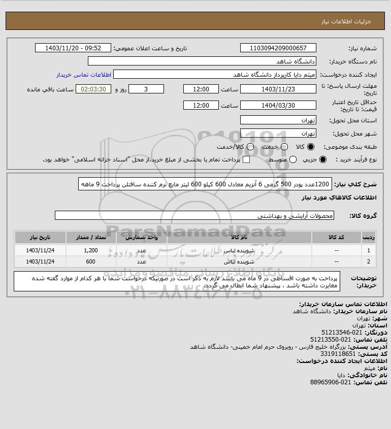 | 2 | -- | شوینده لباس | عدد | 600 | 1403/11/24 |