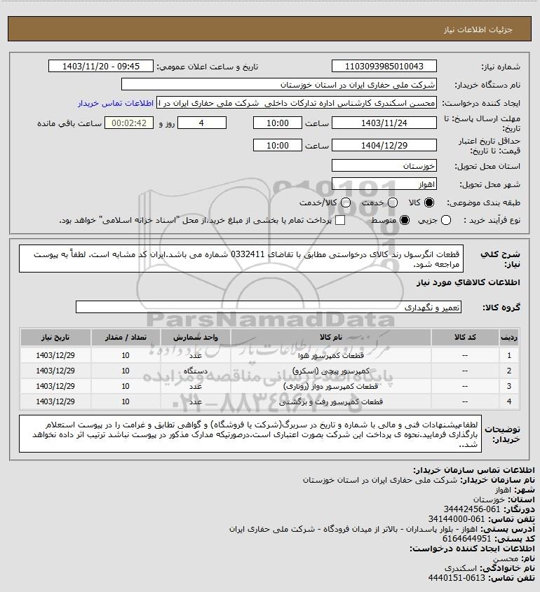 | 1 | -- | قطعات کمپرسور هوا | عدد | 10 | 1403/12/29 |