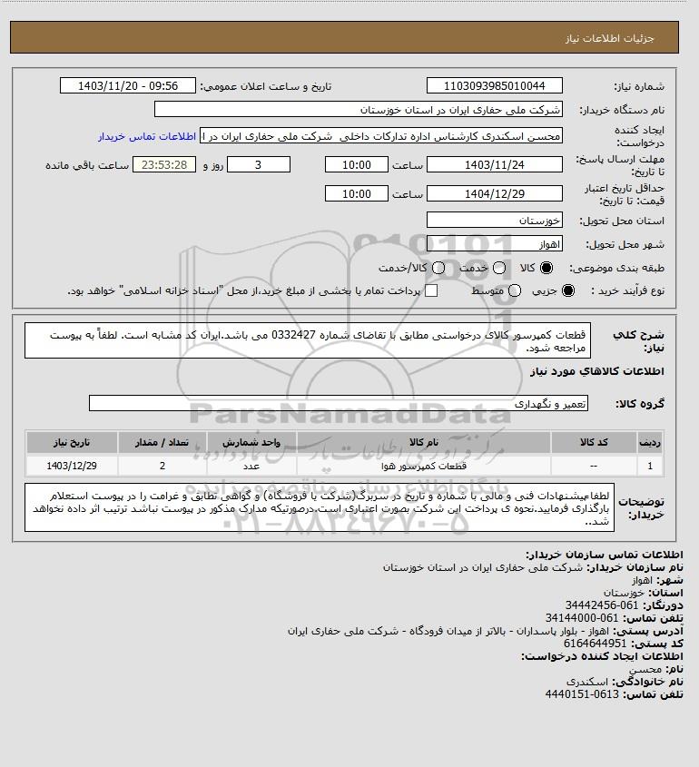 استعلام قطعات کمپرسور کالای درخواستی مطابق با تقاضای شماره 0332427 می باشد.ایران کد مشابه است. لطفاً به پیوست مراجعه شود., استعلام قطعات کمپرسور کالای درخواستی مطابق با تقاضای شماره 0332427 می باشد.ایران کد مشابه است. لطفاً به پیوست مراجعه شود.