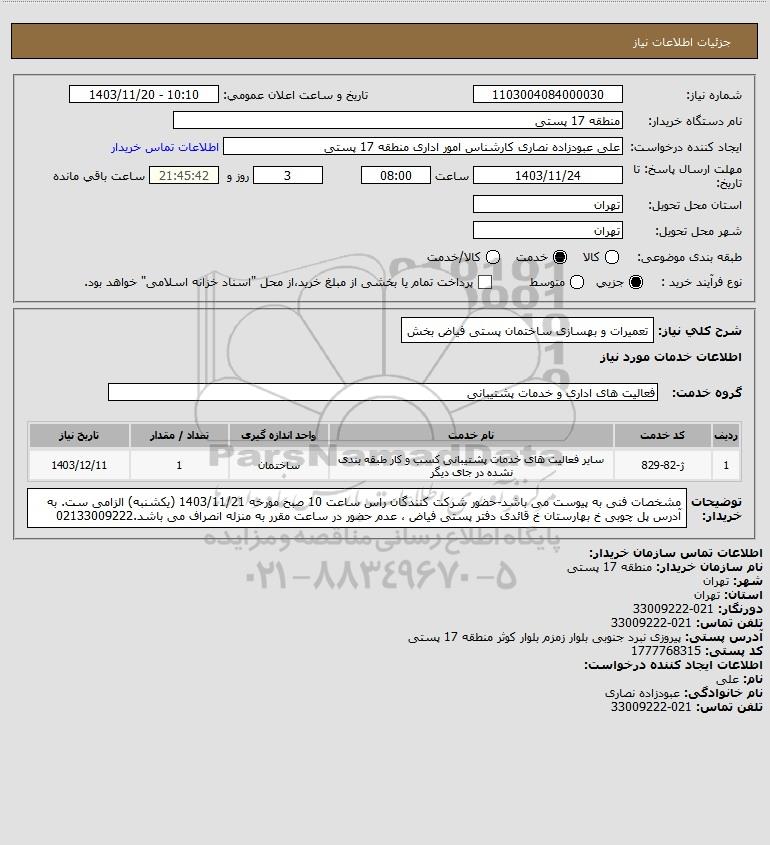 شرح کلی نیاز: تعمیرات و بهسازی ساختمان پستی فیاض بخش