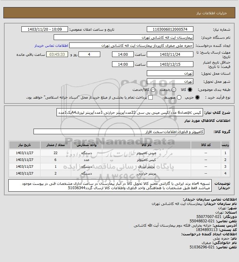 شرح کلی نیاز: کیس pcتعداد6 عدد/کیس مینی پی سی 22عدد/پرینتر حرارتی 1عدد/پرینتر لیزریA4یک1عدد