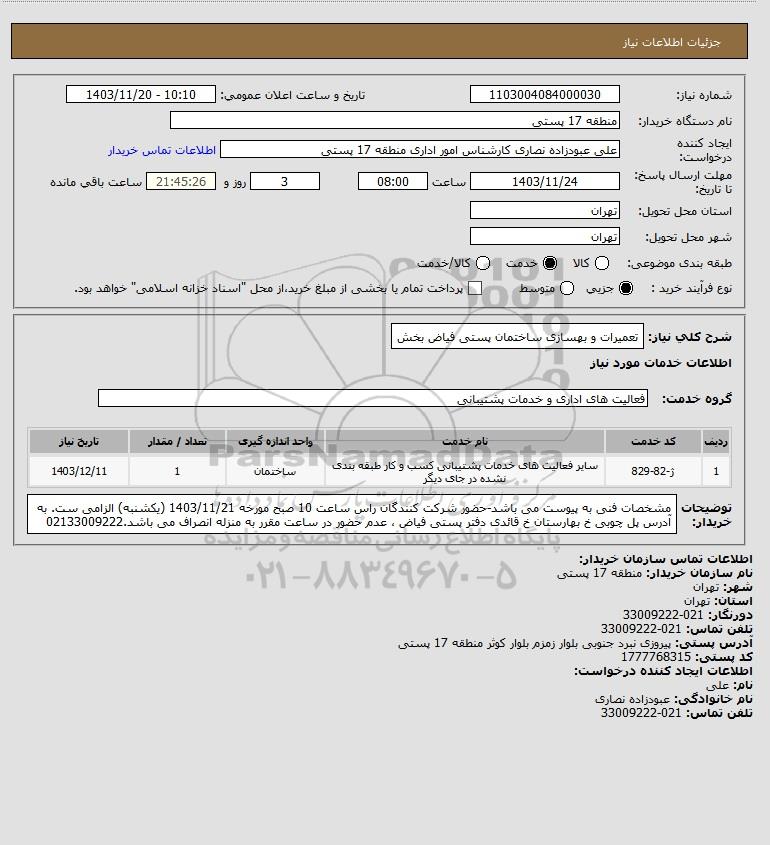 شرح کلی نیاز: تعمیرات و بهسازی ساختمان پستی فیاض بخش