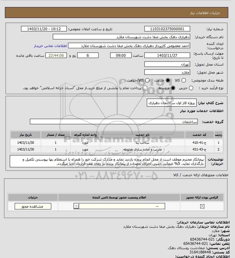 شرح کلی نیاز: پروژه فاز اول ساختمان دهیاری