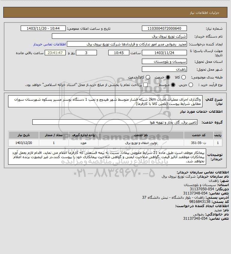 شرح کلی نیاز: واگذاری اجرای عملیات احداث 2km شبکه فشار متوسط شهر هیدوچ و نصب 1 دستگاه بوستر مسیر پسکوه شهرستان سوران مطابق شرایط پیوست (تامین کالا با کارفرما)
