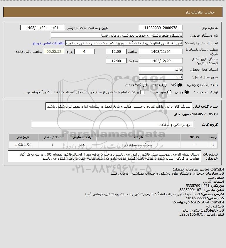 استعلام سرنگ کالا ایرانی دارای کد irc برچسب اصالت و تاریخ انقضا در سامانه اداره تجهیزات پزشکی باشد, استعلام سرنگ کالا ایرانی دارای کد irc برچسب اصالت و تاریخ انقضا در سامانه اداره تجهیزات پزشکی باشد