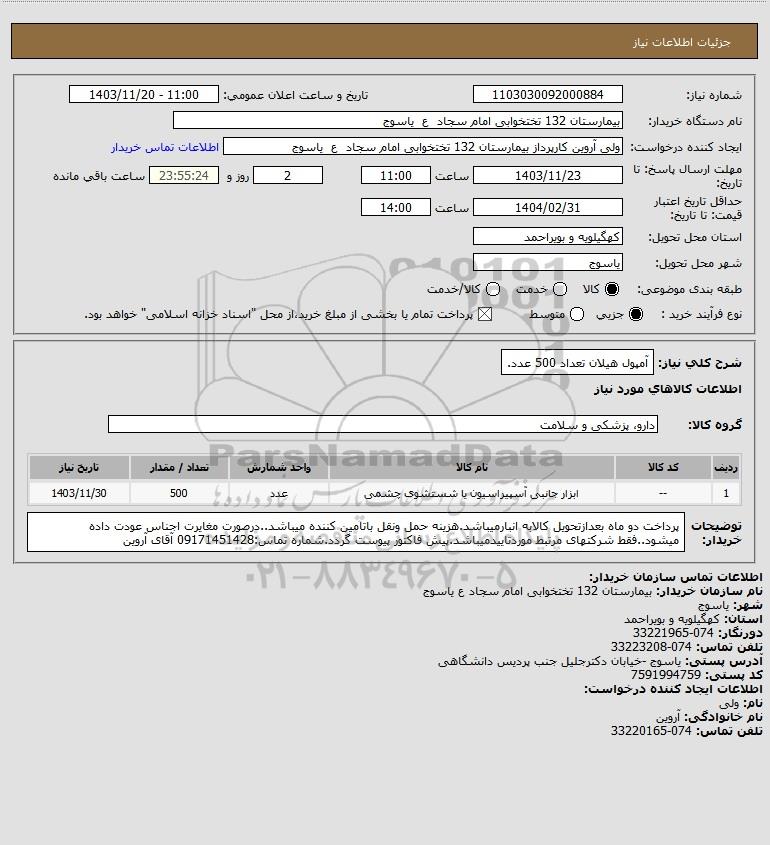 شرح کلی نیاز: آمپول هیلان تعداد 500 عدد.